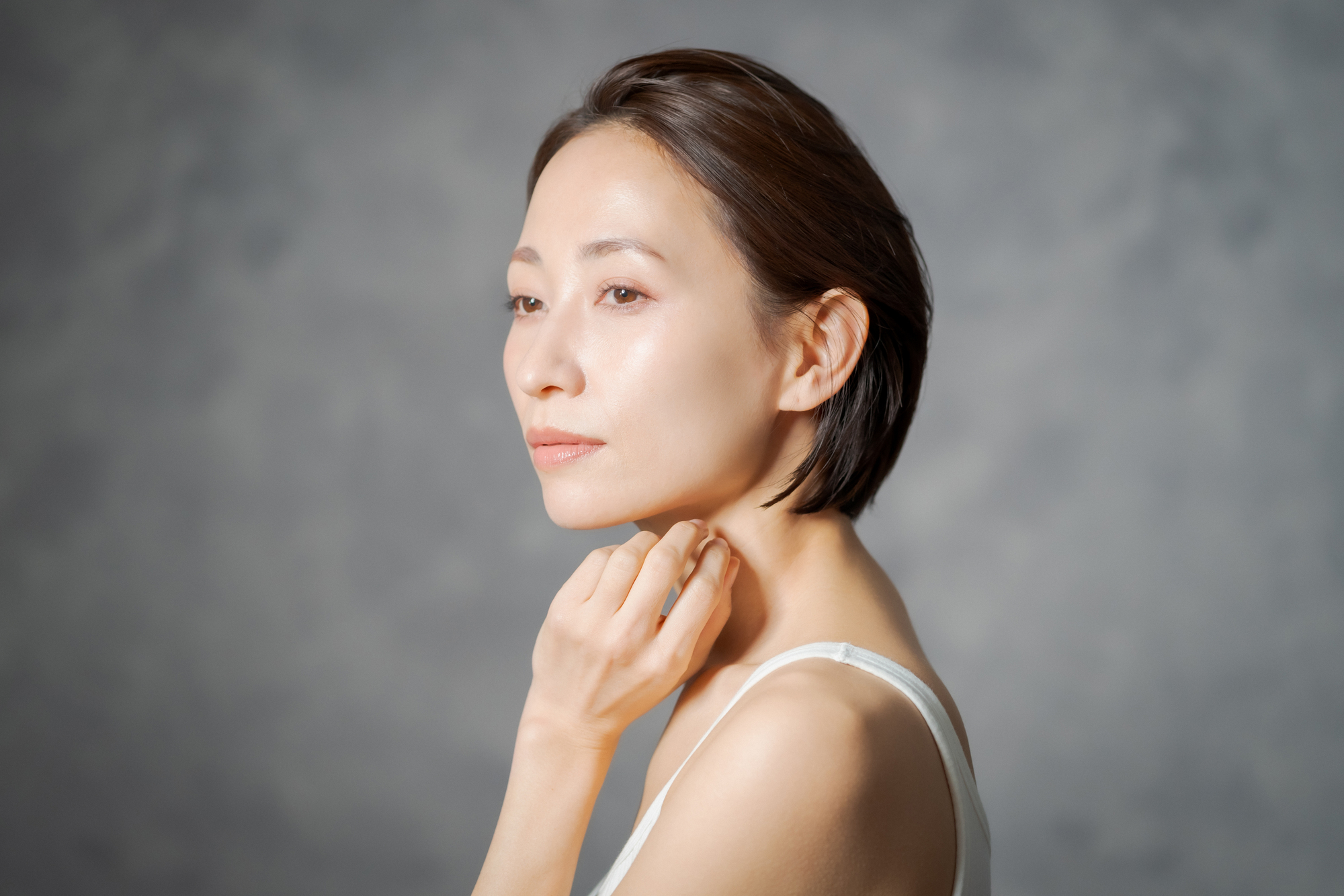 フェイスラインがぼんやりとするのは、顔全体の筋肉(表情筋)の衰えやコラーゲンの減少、脂肪の変化が影響しています。