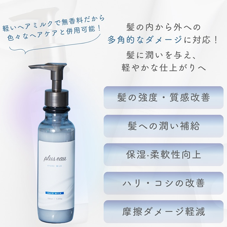 プリュスオー ハイドロミルクは5種類のマルチケラチンを配合し、髪ダメージを内と外から多角的にケアする、毛髪補修に優れたヘアミルクです。