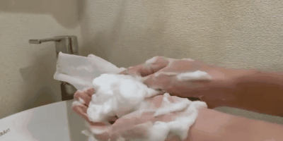 ふんわりした泡が立ったら泡立てネットから泡を集めて、片方の手のひらにまとめましょう。もう一方の手指を使い、さらに手のひらの上でくるくると円をかくように泡立てることで、きめの細かいふんわりとした泡が作れます。